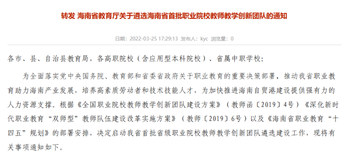 转发 海南省教育厅关于遴选海南省首批职业院校教师教学创新团队