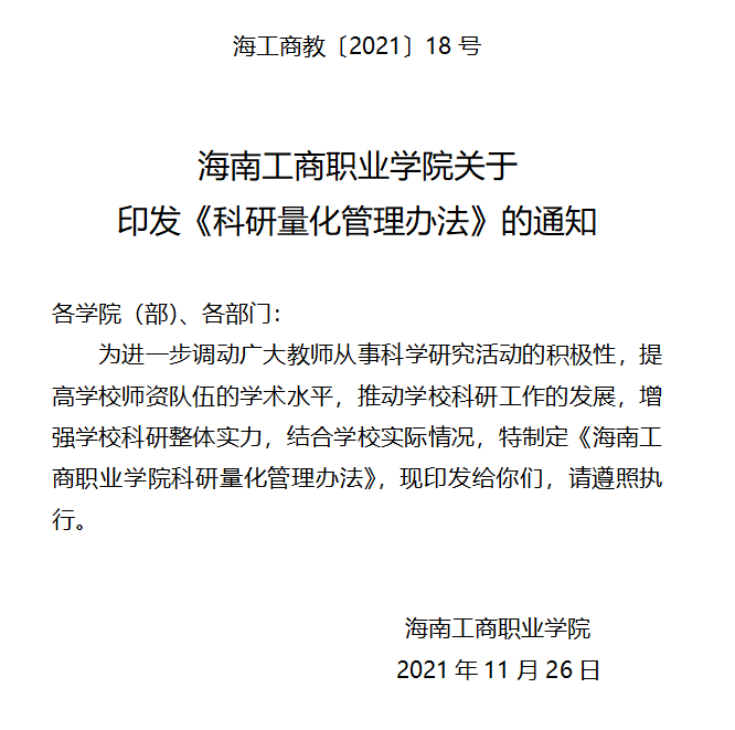 海南工商职业学院关于印发《科研量化管理办法》的通知